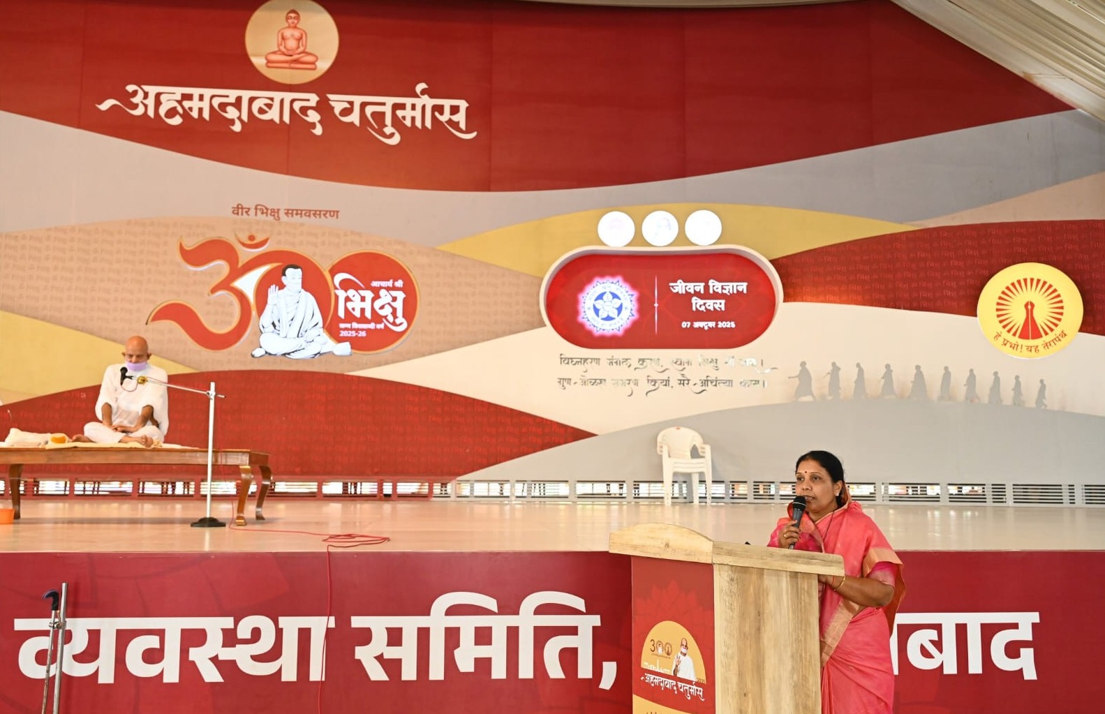 आचार्यश्री की मंगल सन्निधि में अहमदाबाद की मेयर श्रीमती प्रतिभा जैन भी पहुंची थीं। उन्होंने आचार्यश्री के समक्ष अपनी भावनाओं को अभिव्यक्त करते हुए कहा कि आज मुझे आपके श्रीमुख से अत्यंत प्रभावी ज्ञानमय वाणी सुनने का सौभाग्य प्राप्त हुआ है। हम सभी भगवान महावीर के अनुयायी हैं। आपकी सन्निधि मंे जीवन विज्ञान दिवस मनाया जा रहा है। आपकी प्रेरणा और आशीर्वाद से हमने अहमदाबाद के सभी सरकारी विद्यालयों मंे प्रातःकालीन होने वाली प्रार्थना के साथ अणुव्रत गीत के संगान को भी अनिवार्य किया गया है। आपका आशीर्वाद हम सभी पर बना रहे और आपके आशीर्वाद से सामाजिक कार्यों को हम आगे बढ़ाते रहें। आचार्यश्री ने उन्हें मंगल आशीर्वाद प्रदान किया। श्री नरेश सालेचा ने अणुव्रत उद्बोधन के संदर्भ में अपनी भावाभिव्यक्ति दी। अणुव्रत विश्व भारती सोसायटी द्वारा श्री प्यारचंद मेहता (कोयल-मलाड) को जीवन विज्ञान पुरस्कार से पुरस्कृत किया गया। उनके प्रशस्ति पत्र का वाचन अणुव्रत विश्व भारती सोसायटी के उपाध्यक्ष श्री कैलाश बोराणा ने किया। श्री मेहता ने आचार्यश्री के समक्ष अपने कृतज्ञ भावों को अभिव्यक्ति दी। आचार्यश्री ने उन्हें मंगल आशीर्वाद प्रदान किया। इस उपक्रम का संचालन अणुव्रत विश्व भारती सोसायटी के महामंत्री श्री मनोज सिंघवी ने किया। श्री रवि जैन ने गीत का संगान किया। बैंकाक प्रवास श्री हरेन जैन ने अपनी भावाभिव्यक्ति दी।